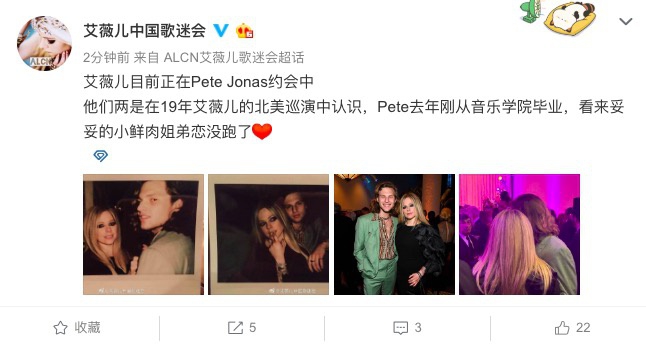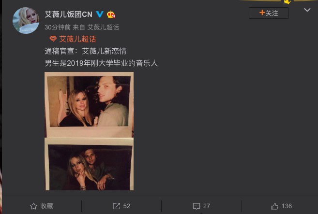 1月27日,艾薇儿中国歌迷会发文称艾薇儿目前正在Pete Jonas约会中,确认艾薇儿新恋