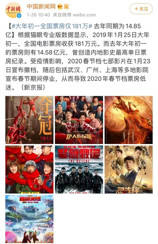 作者 / 坦克 #大年初一全国票房仅181万#话题登上热搜榜。 对比去年大年初一超14亿的票房成绩,今年缩水超过99%。 而每日经济新闻统计的这181万,其实也不是一个精确的大年初一数据。以《叶问4:完结篇》《误杀》《宠爱》为代表的贺岁档以及寒假影片,总计在大年初一获得了50万票房。同时,考虑到不少观众提前购买了大年初一的电影票,但是不少影院临时决定休假的情况出现,由于退票工作还没有完全结束,因此真实的观影人次很有可能不到1万人。 对比昨天香港地区1290万港币(1151万人民币)的成绩,不胜唏嘘。拍sir也不想翻阅古早资料,看这是否破了2003年非典以来的最低单日大盘记录。毫无疑问的是,这一状况至少在未来2周内仍将持续保持。 即便按照最乐观的情况估计,即正月十五左右,武汉疫情有望出现拐点,那么内地影市大盘至少到2月底甚至3月初,才能够回归正常水平。如此下去,预估2020年第一季度票房最终可能报收不足40亿,而如果疫情持续加重,这一数值有可能会更低,中国电影行业也遭遇了有史以来最为严重的一次打击。 制片方——冲击影响50% 对于处于不同项目期的电影项目,受到的冲击影响也各有不同。 处于项目制片、剧本筹备阶段的项目,受到的冲击最小:即便公司无法正常上班,公司人员也可以通过电话、视频会议的方式继续推进工作。 对于已经开机的项目,可谓是影响巨大。可以说,原本准备2-3月开机的项目必将延期拍摄。而正处于拍摄的电影,也会立即停工。这对剧组造成的损失,也可能是除了影院之外最大的。而这不仅仅是针对电影,对需要集中拍摄的剧集、综艺也会带来较大的影响。可能电视台在播放完最近录播的节目后,只能放库存电视剧维生了。 而对于处于后期剪辑、特效工作的电影,也会造成一定的影响。尤其是后期特效工种,都必须在公司的机房内进行操作,必须要求员工到位进行工作。 这对于已经定档2020年暑期,但是没有完成后期甚至尚未杀青的电影来说,就带来了一定的危机感了。最重要的是,即便定档了可以选择跳档,但是因为工期耽误从而导致公司的资金链断裂,就会陷入更加恶性的循环当中,这对于公司体量相对较小的宣发公司来说,可能更加严重。 宣发方——冲击影响80% 随着春节档七部国产片的紧急撤档,二十多家内地一线宣发公司也破天荒地拥有了一个春节假期。这对于包括猫眼、联瑞、麦特、黑马等宣发公司来说难等可贵,毕竟他们可能连续好几年没有度过一个没有项目的春节档了。 当然,日渐严重的疫情也并没有让他们彻底放松,今天《唐人街探案3》已经率先给武汉慈善总会捐出超过100万元的善款,帮助疫情重灾区早日回归正常。 同时,预计已经定档2月的部分国产片也具有较大的几率在未来几天相继撤档,这对于宣发公司来说是否也意味着彻底无活儿可干了呢? 并不是,虽然可能从1月到3月都不会有大体量国产片公映,但这并不意味着宣发公司就完全闲置了。尤其是对于营销公司而言,提前安排好对于未来项目的营销策略,提前剪辑、制作有意向定档五一、端午、暑期甚至明年春节档的电影的物料,也是疫情阶段营销公司们可以做的工作之一。 当然,这对于之前每个月几乎都有项目的宣发公司来说,已经算是重创了。在这一阶段,几乎所有的公司可能都不会继续招聘工作了。 影院——冲击影响100% 虽然第三方平台显示今天单日票房仍然在30万量级,但是根据内部人士透露,目前全国电影票房大盘已经处于基本停摆状态,今天真正有效产出的票房在5万人民币以内,其中90%以上产自于西藏自治区。 而目前西藏地区的排片也在紧急下滑中,未来不排除出现全国院线电影零排片的情况出现。 全国影院集体停滞,这种情况甚至在非典期间也从未有过。并且同样是处于闲置状态,影院要远比宣发公司难过得多。 起码,每个月上万块的房租已经是白白打了水漂了。 可以说,疫情来之前,整个电影行业最难的就是放映端了。单银幕票房产出连年持续降低,50%以上的影城仍然处于饥一顿饱一顿的状态,而距离上一次“饱一顿”的国庆档,已经过去了三个多月,等待春节档喂饱的影城们这次不仅仅没有等来春节档的大爆发,反而是持续至少一个月的“零票房”,这也难怪影城、院线端成为整个电影行业第一个“喊饿”的群体。 疫情当前,我们当然不希望人流密集的电影院在此时贸然开业,但是与其联名对抗所谓的流媒体冲击,不如深刻考虑一下当下的我们还能做些什么。 而电影行业在疫情毁灭级的冲击下,2020年的电影市场版图必定也将发生天翻地覆的变化,这可能是近十年第一个票房大盘下跌的年份,但同时也是第一个不需要制定票房增长KPI的年份。国难当前,众志成城、共克时艰,电影行业在阴霾过后,或许会更好。