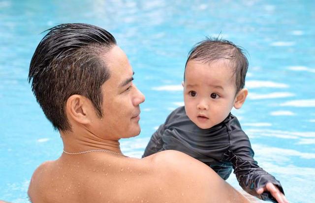 稍微大一点的小家伙就被爸爸带到了泳池,呆萌的眼睛加上淡淡的眉毛看上去超级可爱,感觉比爸爸长得还要好看。