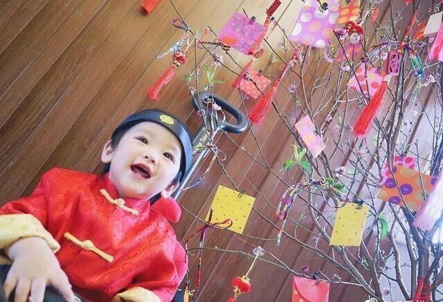 2019年出生的小Rafa真的太可爱了,萌萌的小脸蛋,穿着“唐装”牙齿还没有长几颗,大大的眼睛真的太出色了,小宝贝身后的树上挂满了新年特色的挂件,看上去就就很温馨。