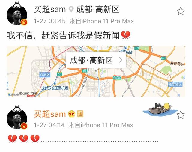 不少明星艺人也都是科比的忠实粉丝,面对偶像意外离世的噩耗,纷纷发文表示不敢相信。张嘉倪的老公买超是一个篮球迷,凌晨得知消息的第一时间,他就发文称:“我不信,赶紧告诉我是假新闻。”然而过了约四十分钟,他确认了消息的真实性后,连发了三个心碎的表情,表达自己的悲伤。