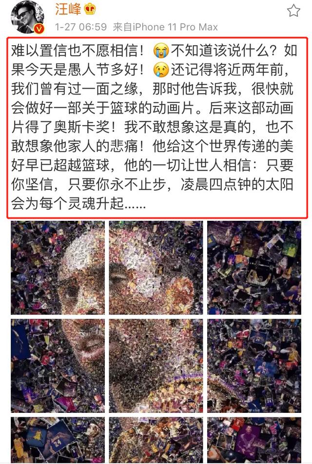 汪峰晒出了科比的九宫格拼图,称这难以置信也不愿相信。他表示自己在两年前与科比曾有过一面之缘。两年后的今天,没想到就会听到他逝世的消息。