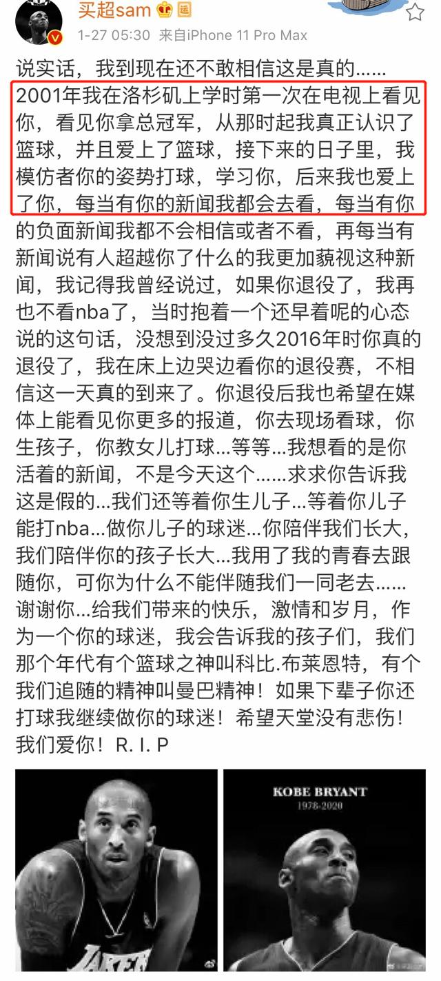 之后买超又发表了一篇长文,他称自己是因为科比而爱上篮球,并且模范科比的姿势打球,学习,后来也爱上了科比。科比退役的那场比赛,他躺在床上边看边哭,看得出是个死忠粉。科比逝世的消息对他来说打击巨大。