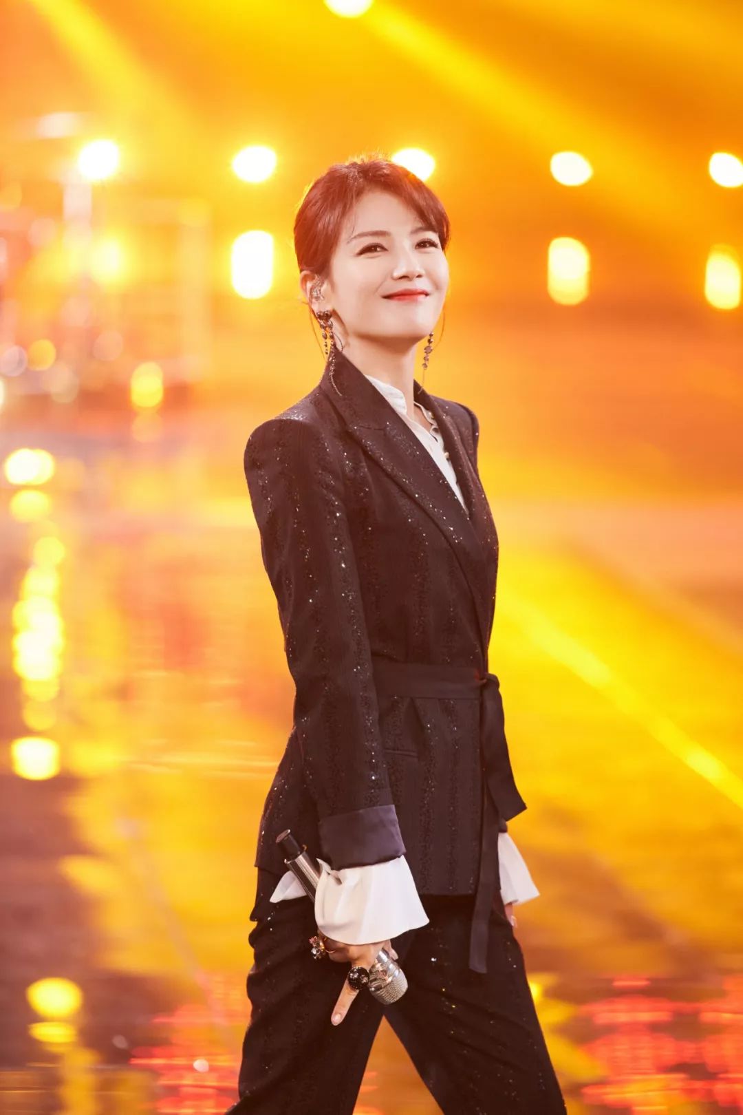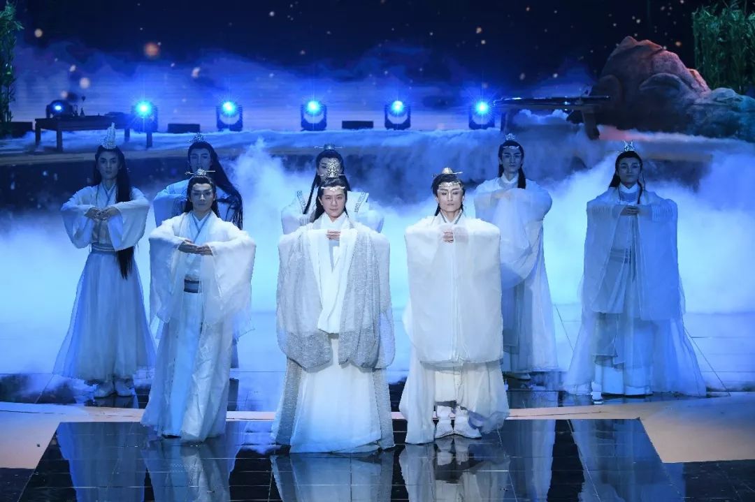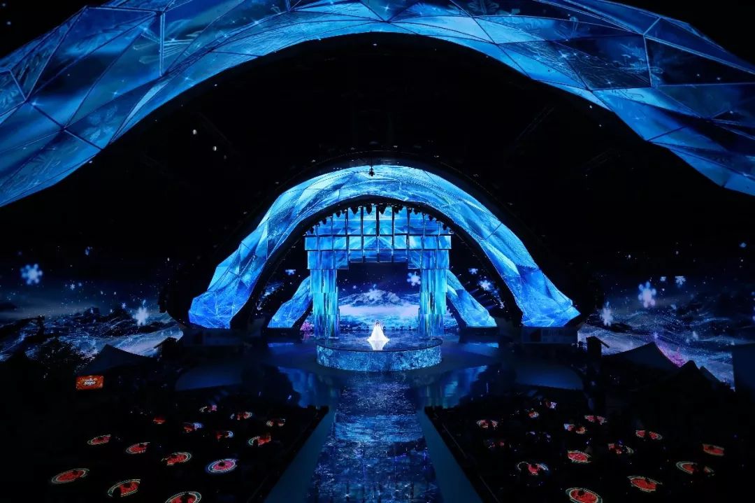在开场大秀中,悬浮在空中的56组矩阵式方柱形数控升降屏幕,三个巨型飘带LED、背景LED大屏,以及AR(视觉加强)技术的完美结合,将观众一瞬间带入千里冰封、万里雪飘的雪国之境。茫茫白色雪原上,杨颖身着雪色纱裙和同色披风,曼妙灵动,亦幻亦仙,以雪国精灵之姿,傲然矗立,为观众打开春天之门,将春之胜景带到春晚现场。