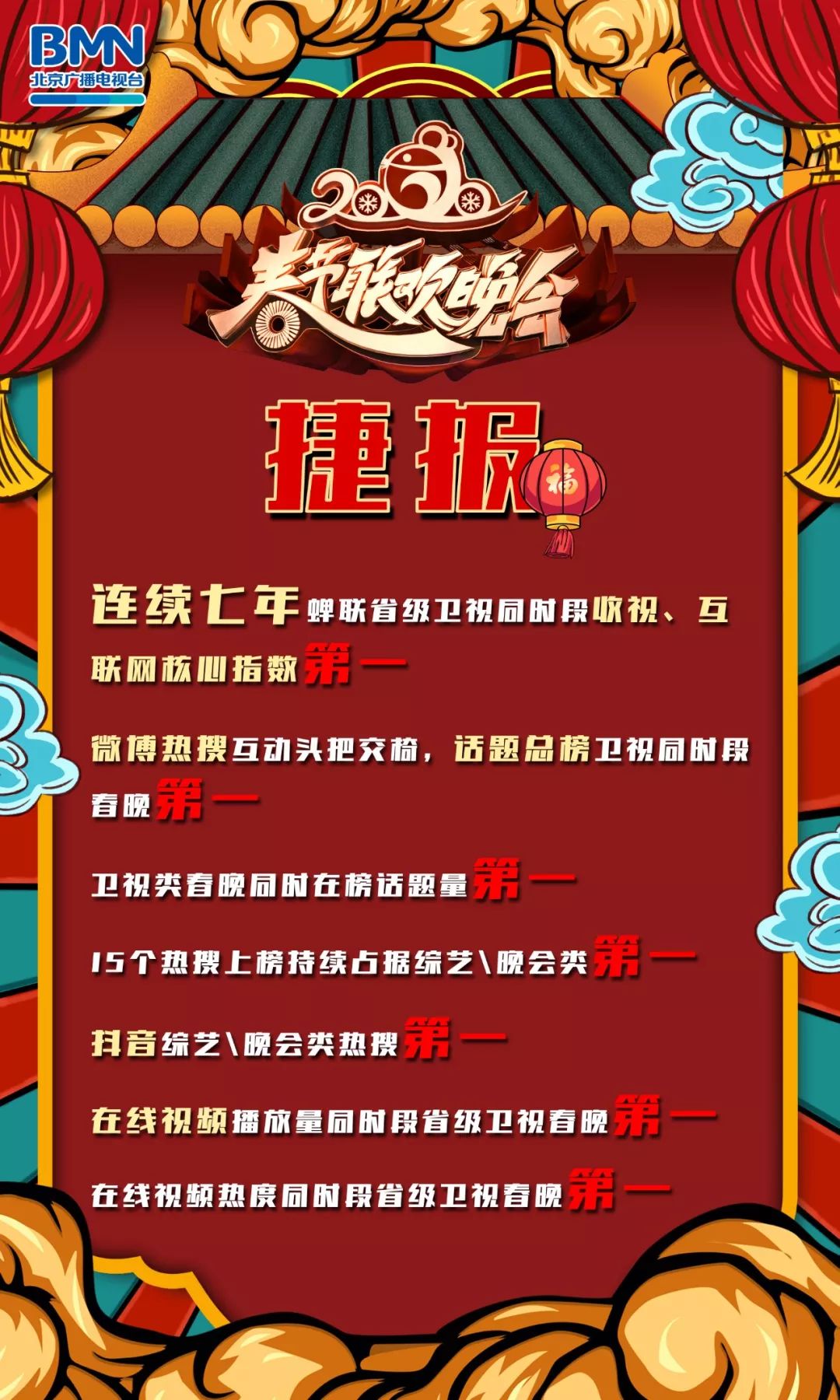 2020北京台春晚不仅赢得了广大电视观众和网民的一致好评,也在多家卫视春晚的竞争中脱颖而出,创下了CSM35城省级卫视同时段收视率与互联网核心指数七连冠的傲人战绩。