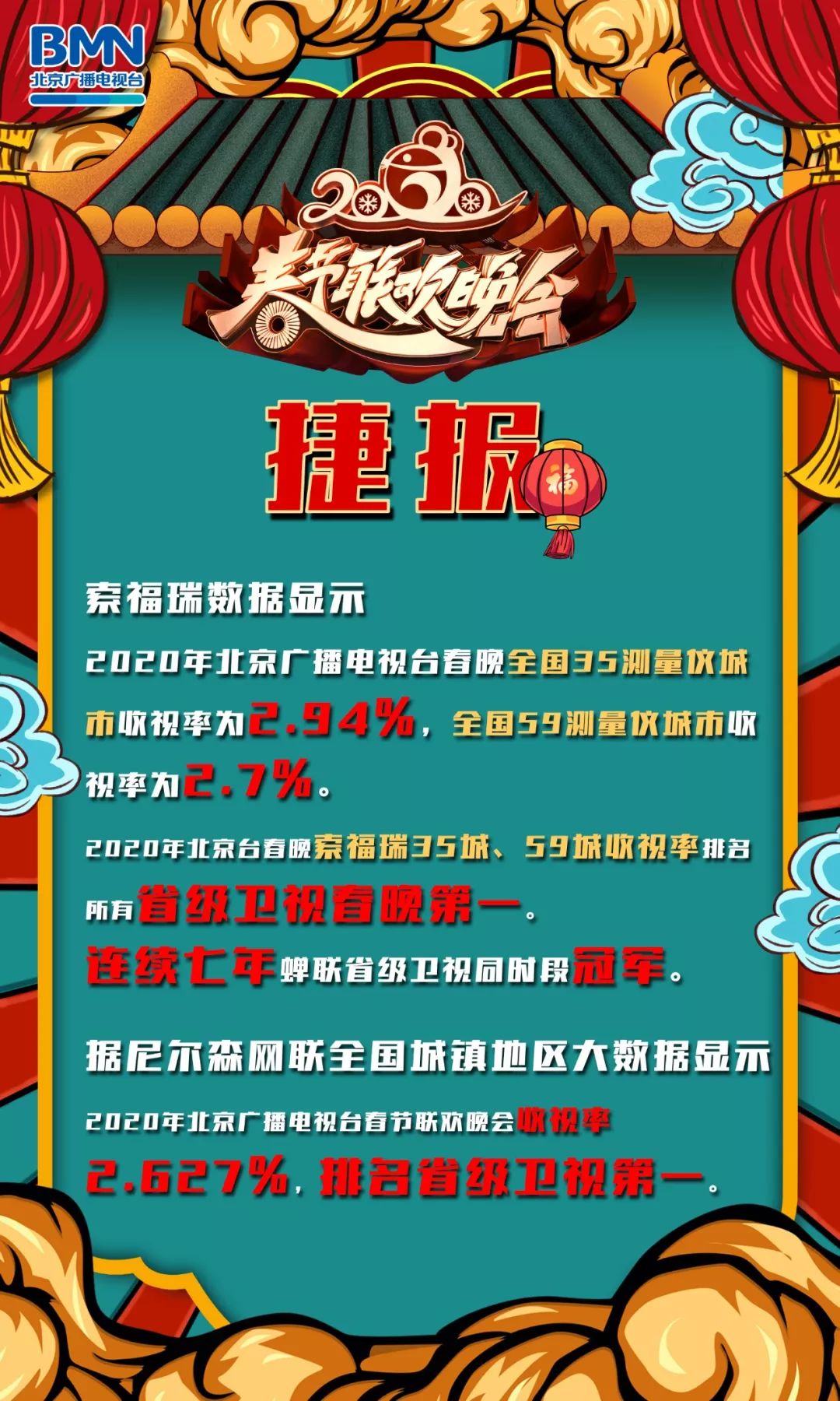 索福瑞数据显示,2020年北京广播电视台春晚全国35测量仪城市收视率为2.94%,全国59测量仪城市收视率为2.7%。2020年北京台春晚索福瑞35城、59城收视率排名所有省级卫视春晚第一。连续七年蝉联省级卫视同时段冠军。据尼尔森网联全国城镇地区大数据显示, 2020年北京广播电视台春节联欢晚会收视率2.627%,排名省级卫视第一。