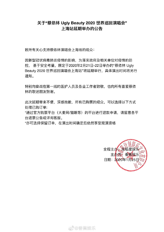 1月25日,蔡依林2月21日-22日上海演唱会确认延期,具体演出时间另行通知。已购票观众可通过官方购票平台(大麦网/猫眼等)平台进行退款申请;也可以保留订单,演出时间确定后依然享受观演资格。