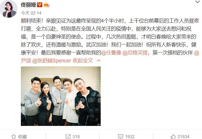 佟丽娅写道:“顺利结束!亲眼见证为这最终呈现的4个半小时,上千位台前幕后的工作人员昼夜打磨,全力以赴,特别是在全国人民关注的疫情中,能够为大家送去慰问和祝福,是一个自豪神圣的使命。过程中,几次热泪盈眶,才明白春晚给大家带来的除了欢庆,还有温暖与激励。武汉加油!我们一起加油!”