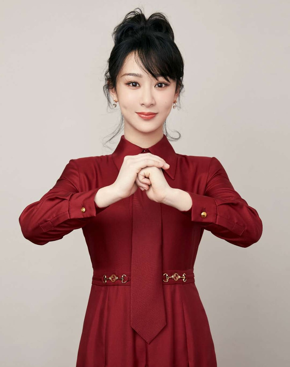 杨紫红色连衣裙,拱手送上新年祝福。