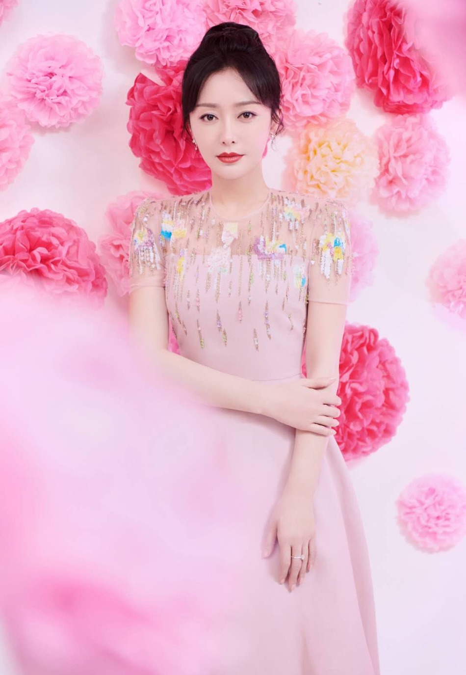 秦岚一袭粉色紧身连衣裙,扎丸子头优雅大方。