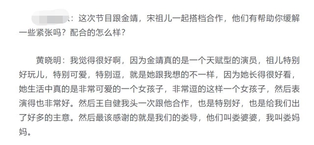 黄晓明对两位女演员的评价非常高,称金靖很有天赋,大赞宋祖儿很逗很可爱。