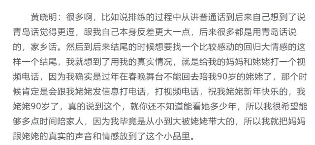 当晚,黄晓明接受媒体专访,谈及这次演出的幕后故事,原来在节目最后催泪一幕,黄晓明与姥姥的对话是真实的,他提前将自己跟姥姥的对话录下来,加入到节目中,用这样的形式陪伴姥姥过年。