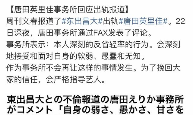 随后唐田英里佳也发了道歉声明,