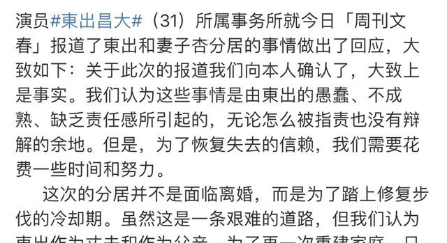 一开始文春报道东出昌大最近和杏分居了,