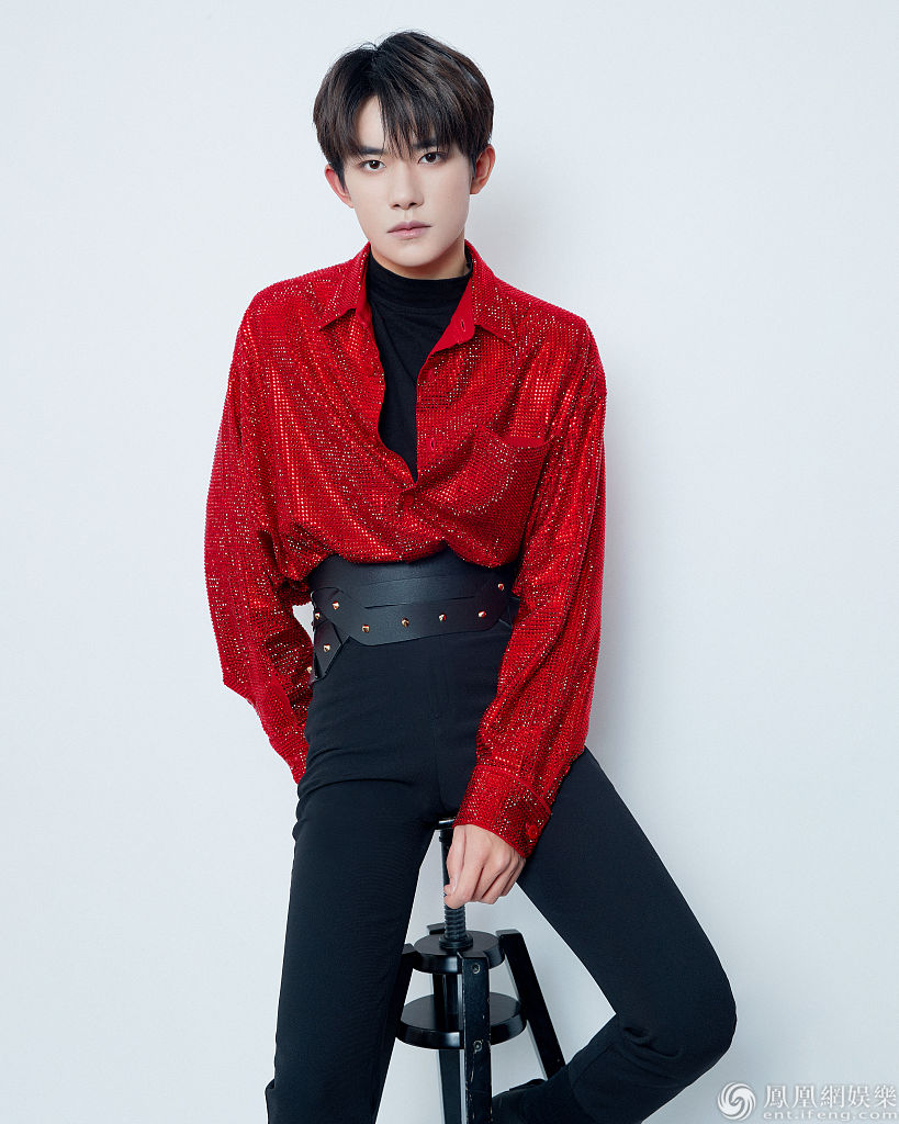 易烊千玺身穿红衣黑裤。