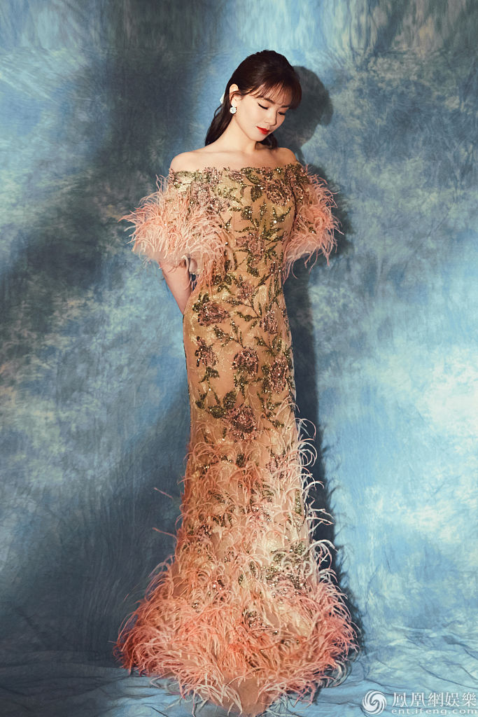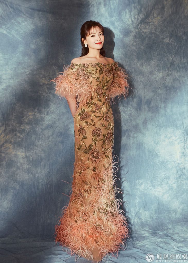 刘涛身着橘色刺绣羽毛长裙美艳大气。