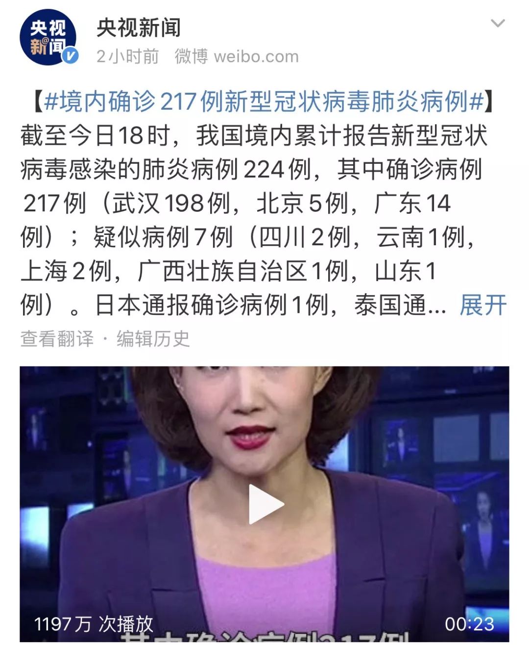 截至1月20日18时,新型冠状病毒感染肺炎确诊217例。其中武汉市198例,北京市5例,广东省14例。