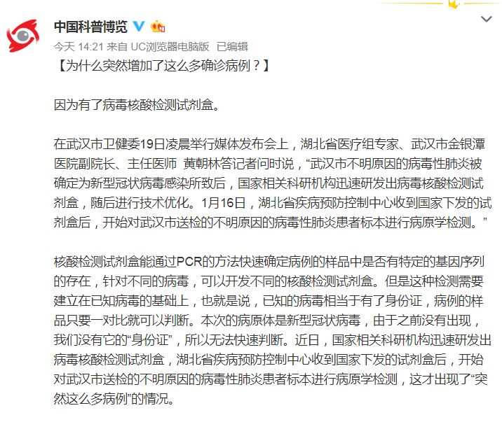 “其实,科研机构第一时间有针对性的研发出病毒核酸检测试剂盒。各地在收到下发的试剂盒后进行检测,才能逐一判断。”
