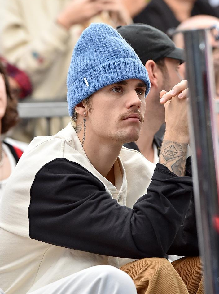 比伯戴小蓝帽亮相,台下与好友热聊不忘拿手机拍照,与卢西安合影大摆搞怪pose。
