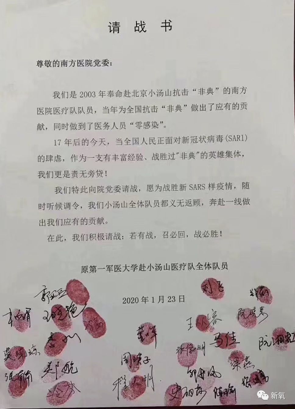 当年在小汤山打过非典战役的原第一军医大学小汤山医疗队全体队员,立下了请战书,“若有战,召必回,战必胜!”