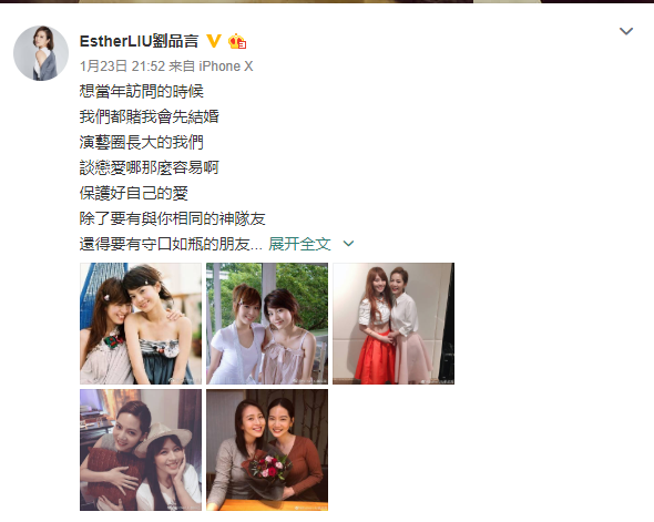 晒出的照片中,有两人出道的多张合影,甜蜜友好而青涩,让网友一起见证了两人之间美好甜蜜的友谊。网友看到微博后纷纷围观并留言祝福,称:“两个漂亮姐姐都要幸福!”“好感动,相信你可以找到属于自己的幸福!”“青春记忆啊!”