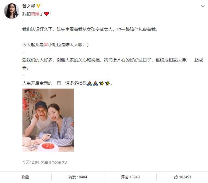而曾之乔则甜蜜的表示表示”我们认识好久了,陈先生看着我从女孩变成女人,也一路陪伴包容着我,今天起我是曾小姐也是陈太太啰“。