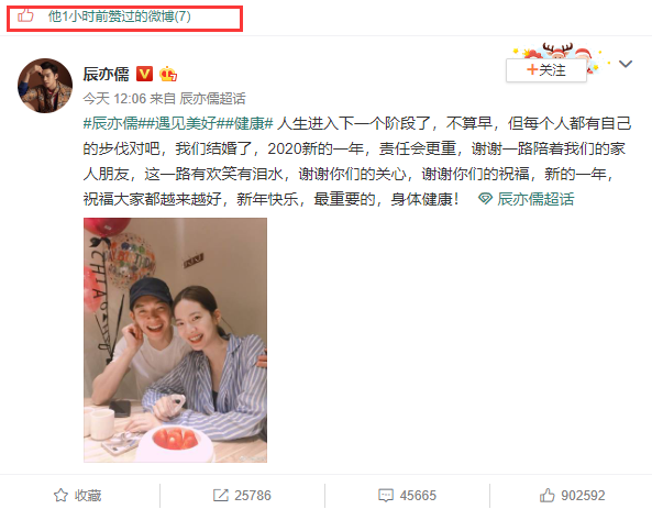 相比之下汪东城却疑似”村里断网“,没有及时表态,很久才点赞了辰亦儒公布婚讯的微博。