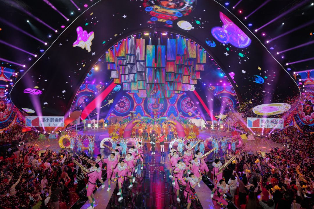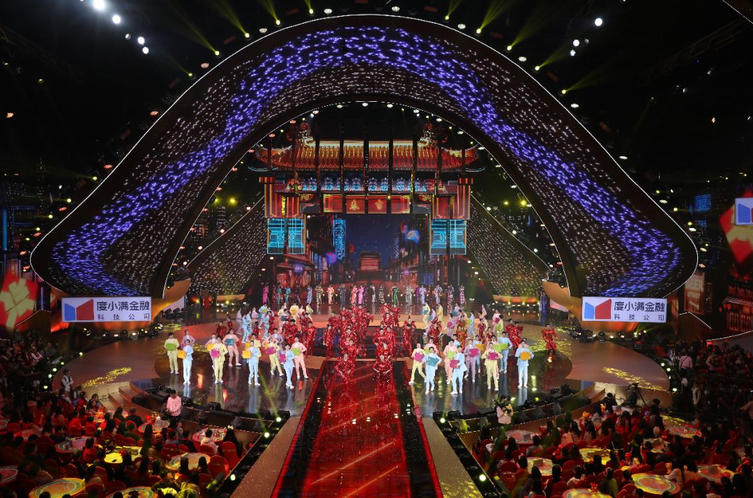 舞台整体采用飘带形流线斗拱式结构的整体布局,LED屏体在视觉上“悬浮”于空中,“T”型LED地屏直通观众席,缔造观众与演员面对面式体验感。阶梯形主观众席及舞台周边观众席,呈现“祥和的围拢感”。两侧高台提供了舞台落差,增强画面的层次。舞台共设置空中56组矩阵式方柱形数控升降屏幕,后区三部大型数控阶梯式升降机(外挂LED)和中心可升降旋转(180°)的数控圆台,应对节目需求的同时,满足了纵深及画面错落的需求。 设置具有针对性的类型灯具接近1800余台,保持色彩高还原度,配合全新数控葫芦TRUSS,根据节目适时调整造型,带给观众更震撼更温暖的观看体验。5.1环绕沉浸式的制作方式提供更加精准的声源定位,也提升音乐聆听体验,通过对音乐中的部分元素、声部进行声像定位的处理,以及各环绕音箱会模拟室内各个墙壁面的自然反射混响声,增强音乐的空间和包围感,突出“身临其境”的感觉。