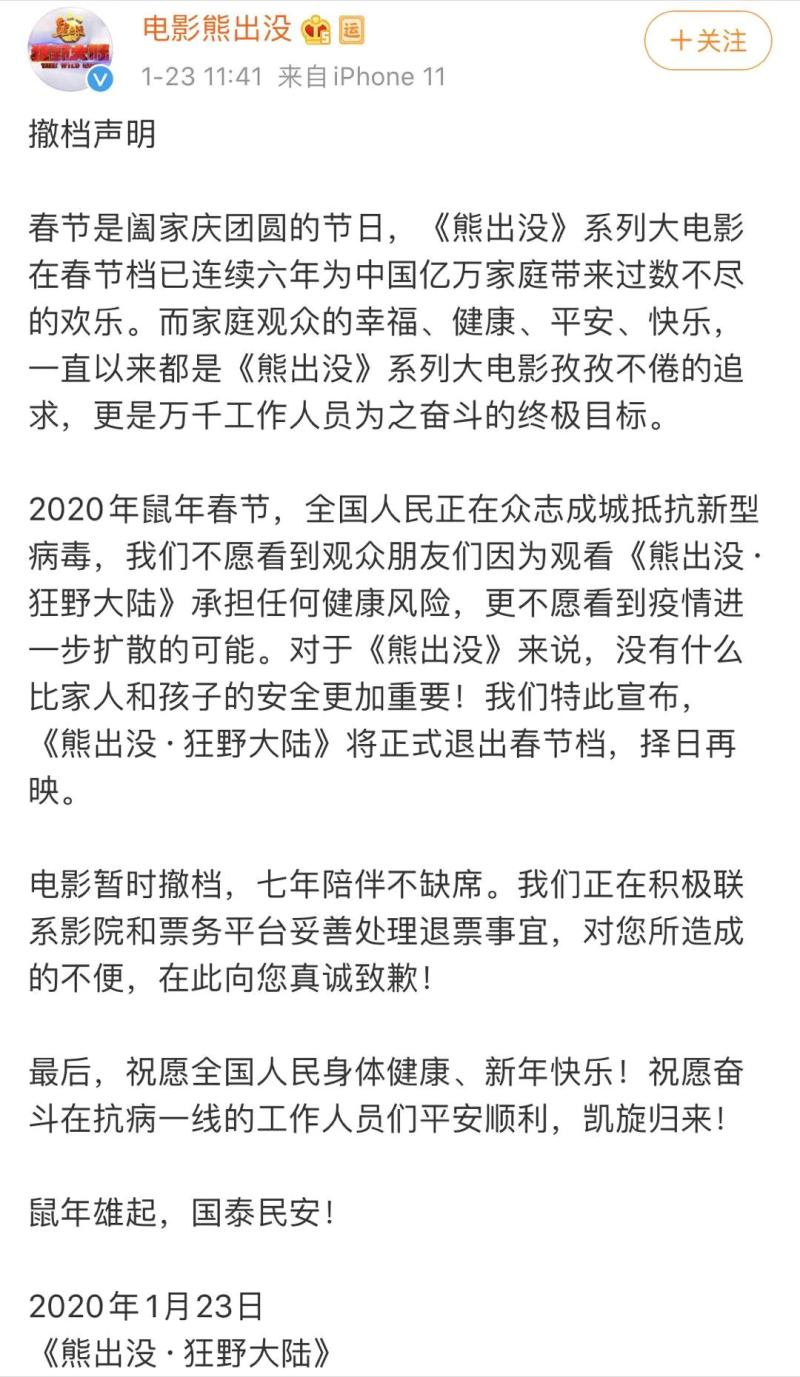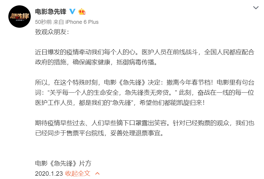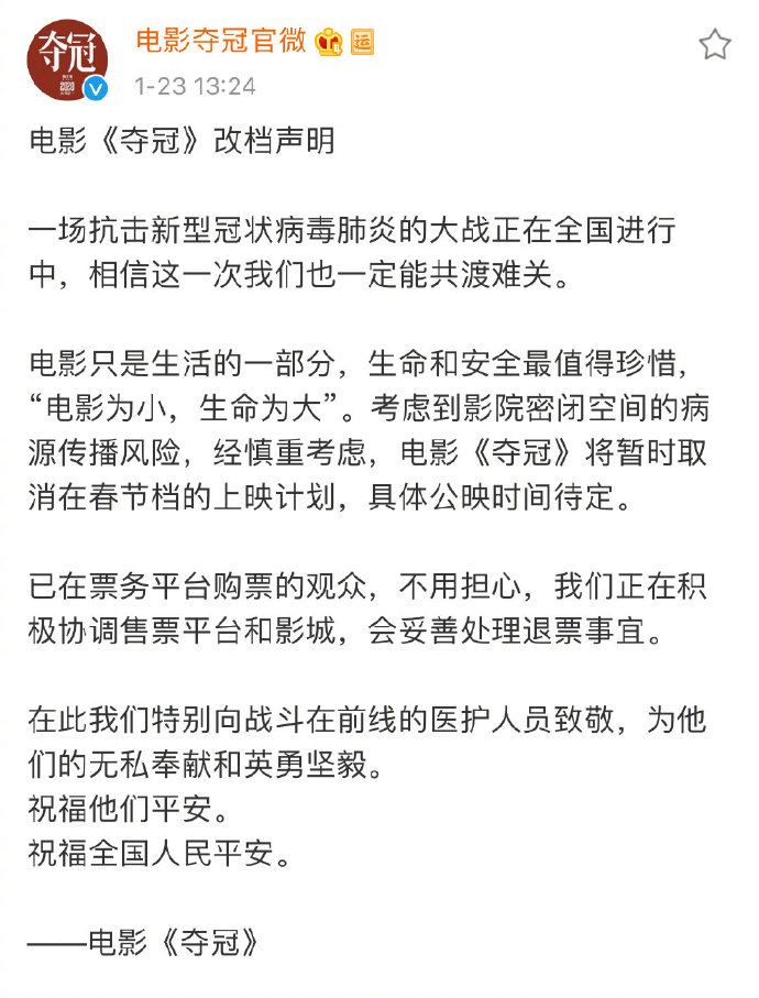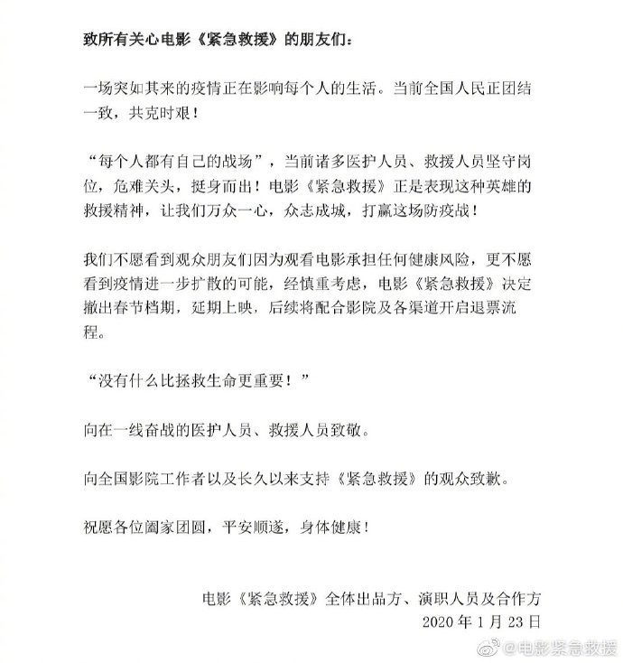 至此,七部春节档待映影片全部宣布撤档,具体档期时间未定,并将配合影院展开退票工作。各片方纷纷表示,“以疫情为重,以生命为重”,医护人员在前线战斗,全国人民都应配合政府的措施,确保阖家健康,抵御病毒传播;并向每一位奋战在一线的医护工作人员致敬。