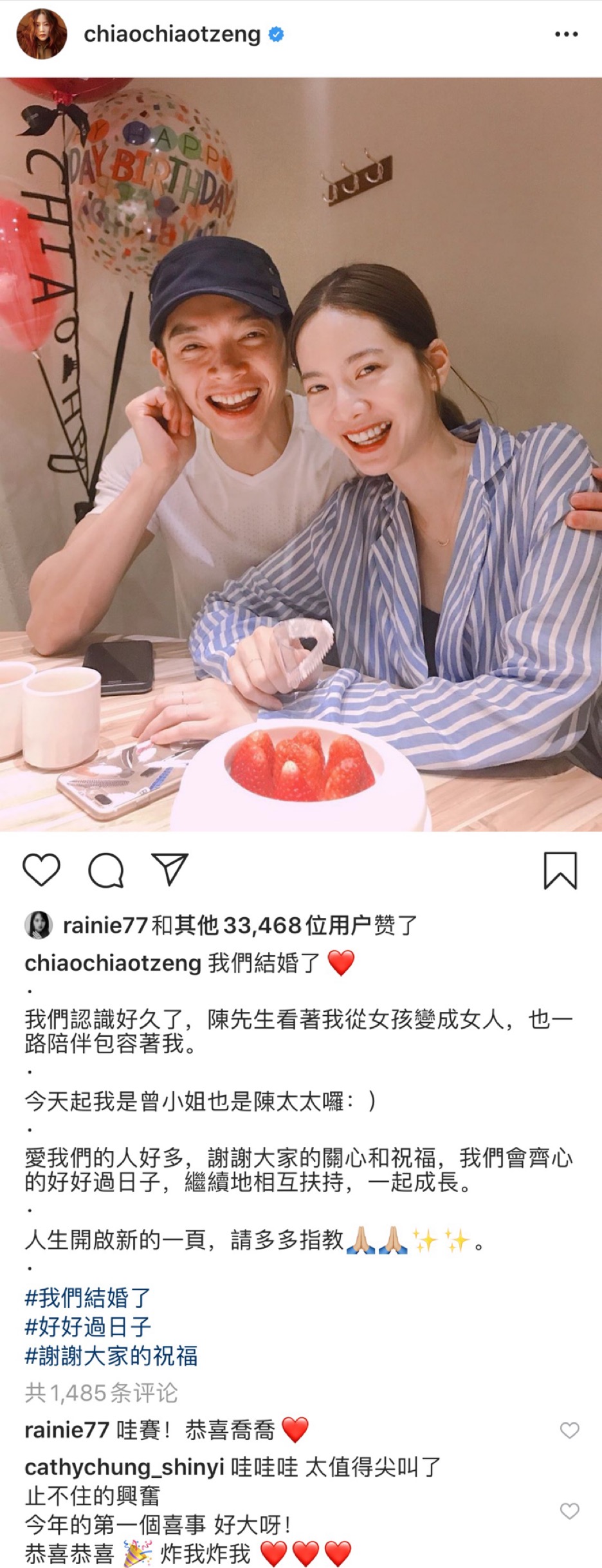 据台湾媒体报道,辰亦儒与曾之乔绯闻传了9年,却始终不承认与对方的恋情,在2020年的小年夜,两人终于发布喜讯,证实结婚了!曾之乔在IG写道“我们认识好久了,陈先生看着我从女孩变成女人,也一路陪伴包容着我。今天起我是曾小姐也是陈太太咯”。