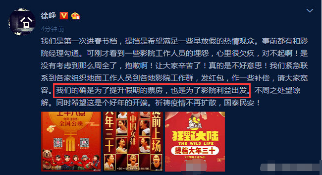 面对外界的争议,徐峥及时发微博道歉,称提挡是希望满足一些早放假的热情观众,而且已经跟影院经理沟通好,对于影院工作人员的埋怨,心里感到很歉疚,是因为他没有考虑那么周全,让大家辛苦受累,并且表示会发红包给加班的工作人员作补偿,同时徐峥也坦言,提档的确是为了提升假期的票房,也是从影院的利益出发。