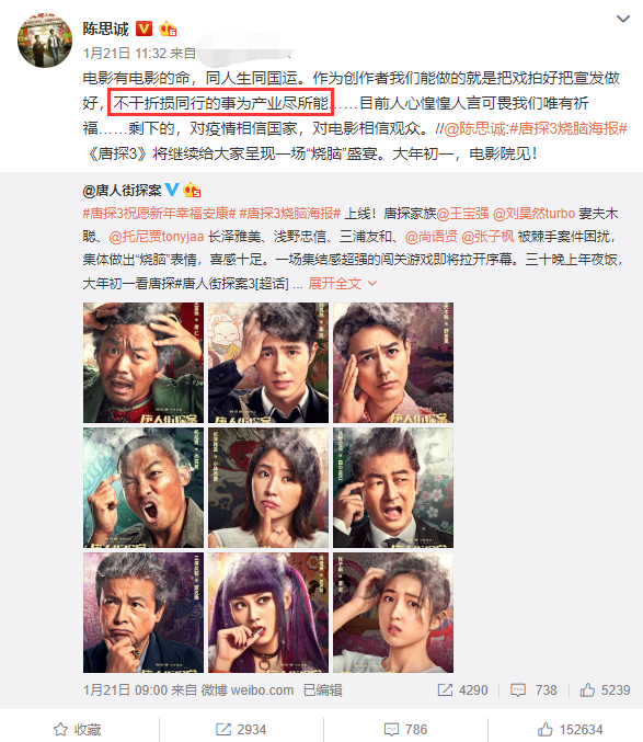 1月21日上午,陈思诚发微博宣传新电影《唐人街探案3》,并且写道”电影有电影的命,同人生同国运,作为创作者我们能做的就是把戏拍好把宣发做好,不干折损同行的事为产业尽所能……“