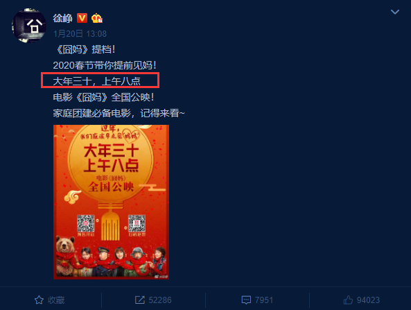 因为1月20日,徐峥的电影《囧妈》突然官宣提档,原本大年初一公映,提档大年三十上午八点公映,该消息曝光后在网上炸了锅,很多在影院工作的网友都留言骂徐峥”是疯了吗?我们影院一线的工作人员一年到头就只大年三十能好好休息了,居然提档?“