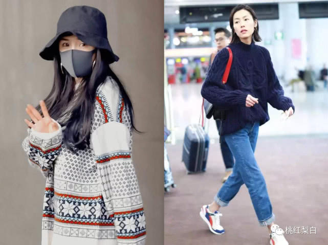 刘雯和杨幂的机场私服里,也经常出现各色纹路的大毛衣。