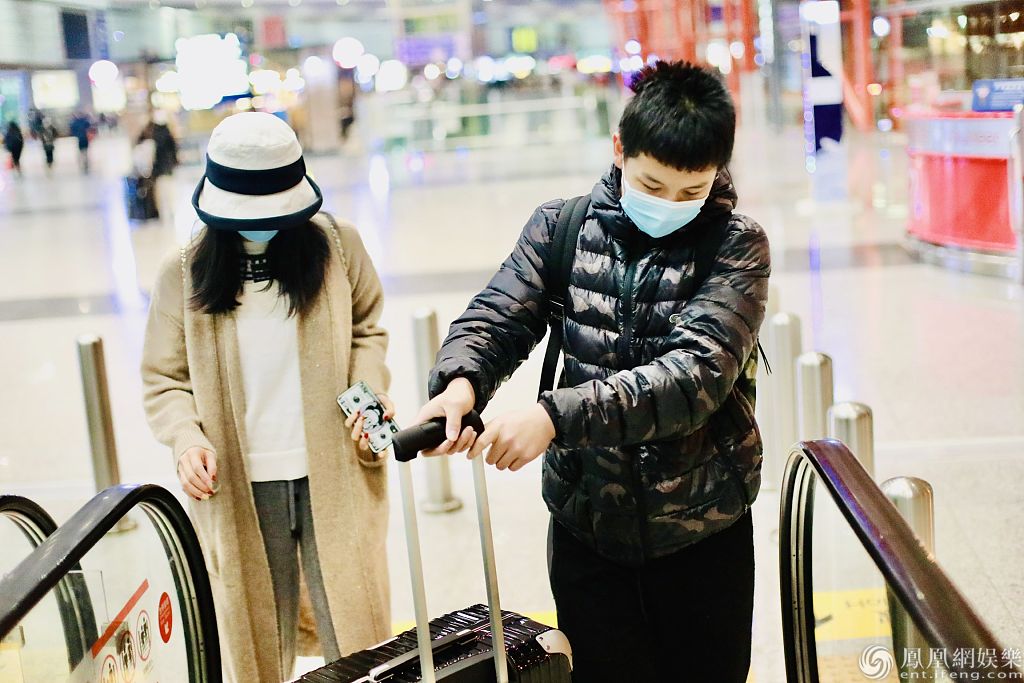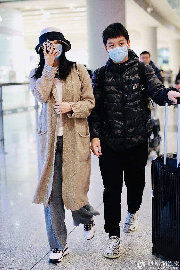 2020年1月23日,北京,王艳和儿子王泓钦现身机场。