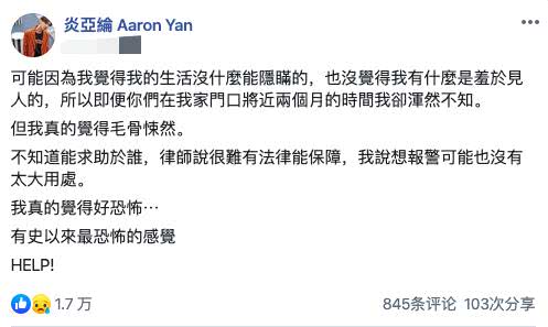 炎亚纶难过地表示,"不知道能求助于谁,因为律师说很难有法律能保障,他也认为报警可能也没有太大用处",直呼"我真的觉得好恐怖,有史以来最恐怖的感觉",还大声呼救"help(救命)"。