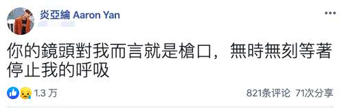 最后他还写下"你的镜头对我而言就是枪口,无时无刻等着停止我的呼吸",字里行间都能感受到他对狗仔偷拍的不满与无能为力。