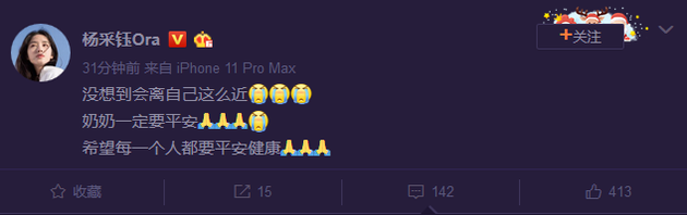 1月22日晚,杨采钰发文为奶奶祈福,疑似透露奶奶染上新型冠状病毒肺炎,发文写道:“没想到会离自己这么近,奶奶一定要平安,希望每一个人都要平安健康!”目前她已删除了这条微博。据悉,杨采钰是武汉人。758微信扫一扫复制下方链接,去粘贴给好友吧-杨采钰奶奶疑似感染新型肺炎 发文祈福后删除复制链接本文由网络整理 © 版权归原作者所有