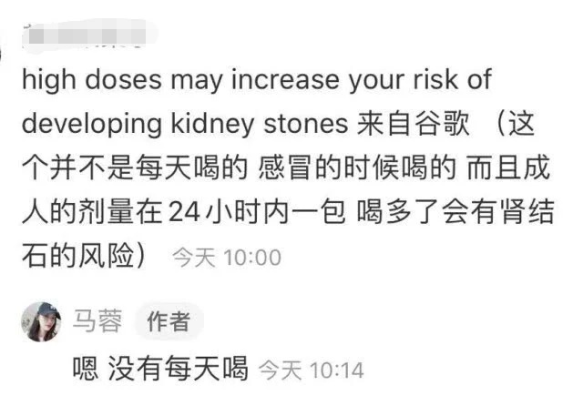 不过,网友还是觉得,推荐维生素C跟化妆品不一样,应该谨慎一些,毕竟是推荐给网友,更应该说清楚服用的细节以及作用。