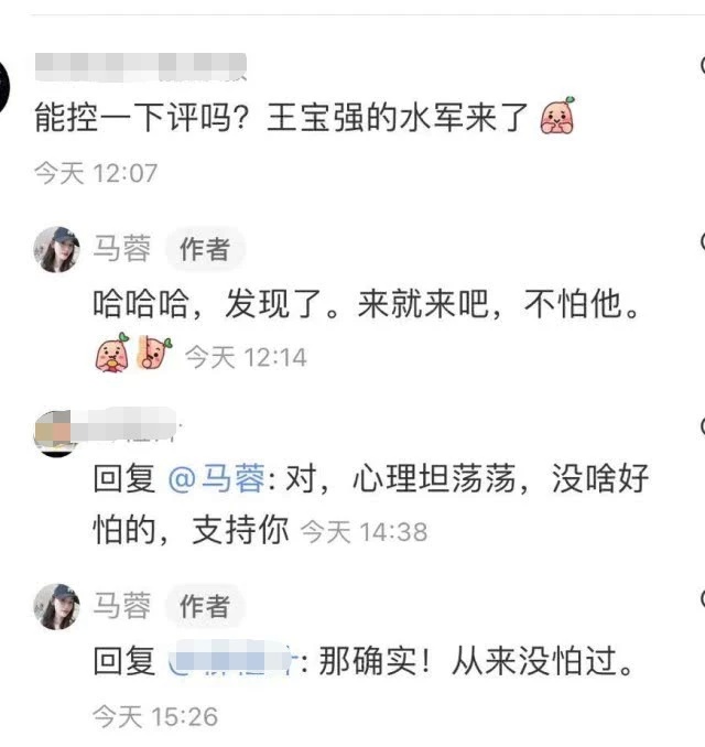 事实上,这些可能是正常网友的质疑,不过马蓉却认为这是“王宝强水军”,回复了关于王宝强的留言,还说自己心里坦荡,从来没有怕过他的水军。