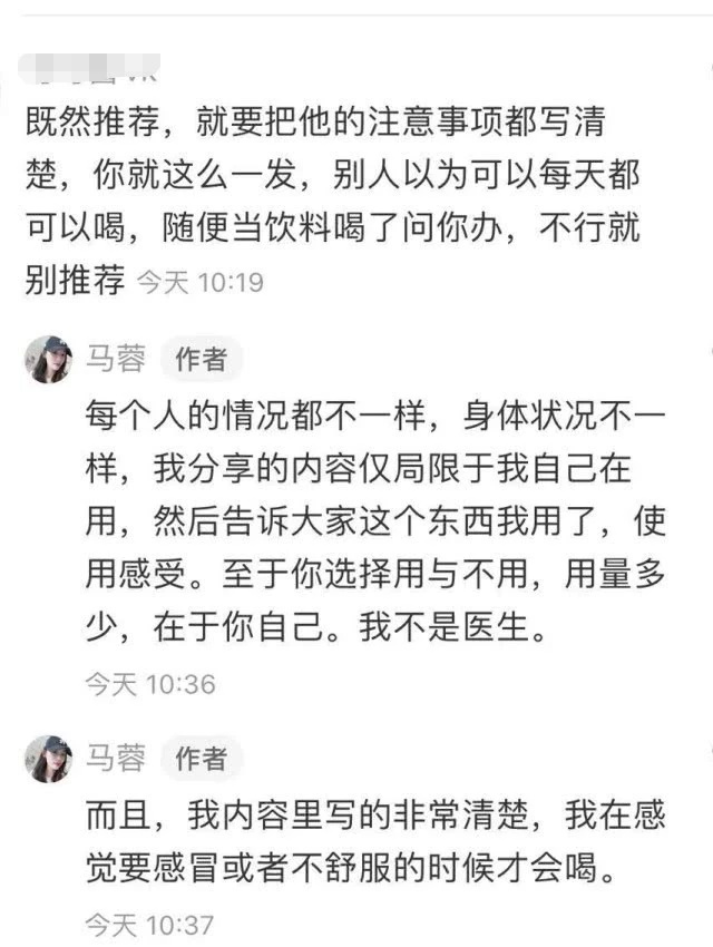 马蓉认为自己在文中写清楚了感冒时才吃,如果网友看错,她又不是医生,没有必要负责任。