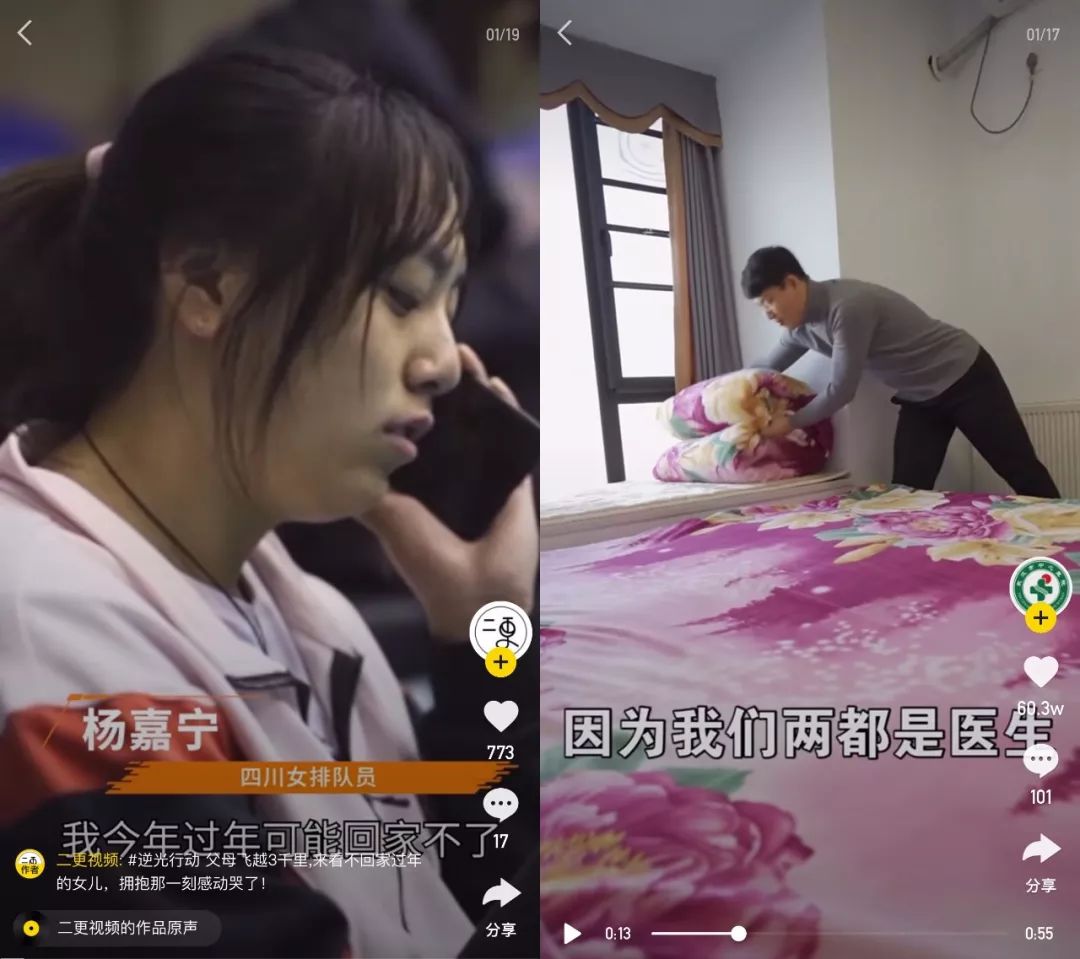 比如快手针对部分春节不能回家的人群,发起“逆光行动”,记录自己在过年加班的故事,很多视频由于真实、走心,也获得了不错的观看热度,比如其中,账号“武汉市中心医院”发布的一条加班短视频,3天内就获得了60.3万的赞。