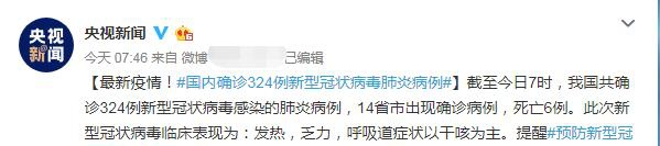 截至1月22日上午7时,国内新型冠状病毒肺炎确诊324例,死亡6例,14省市出现确诊病例。