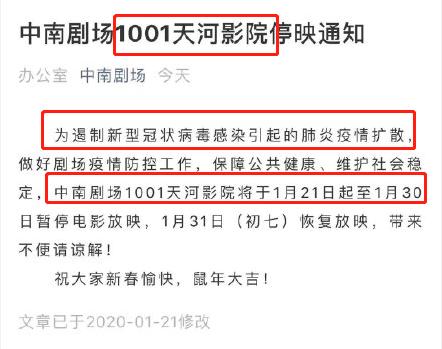 中南剧场1001天河影院在通知中称,为了遏制新型冠状病毒感染引起的肺炎疫情扩散,决定将于春节期间暂停放映,直到大年初七才恢复。