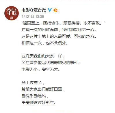 电影《夺冠》(原名《中国女排》)在1月21日发布微博,“在每一次的困难面前,我们都能团结一心。这是这片土地上的人最可爱、可敬的地方。相信这一次,也不会例外”。
