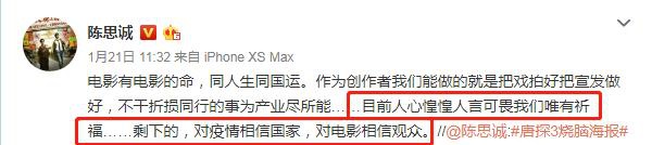 陈思诚发文谴责《囧妈》等电影擅自提档时,还说了这么一句话,“目前人心惶惶人言可畏我们唯有祈福……剩下的,对疫情相信国家,对电影相信观众”。