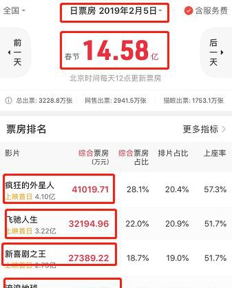 2019年春节档,有四部电影首日票房超过一亿,最高是《疯狂的外星人》,首日票房4.1亿,远超《唐人街探案3》足足一倍多、