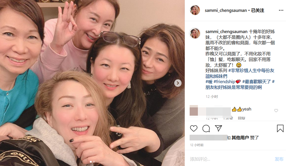 郑秀文配文:“十几年好姐妹,大家都不是圈内人,十多年来,风雨不改地约会和见面,每次都是一个都不能少。”