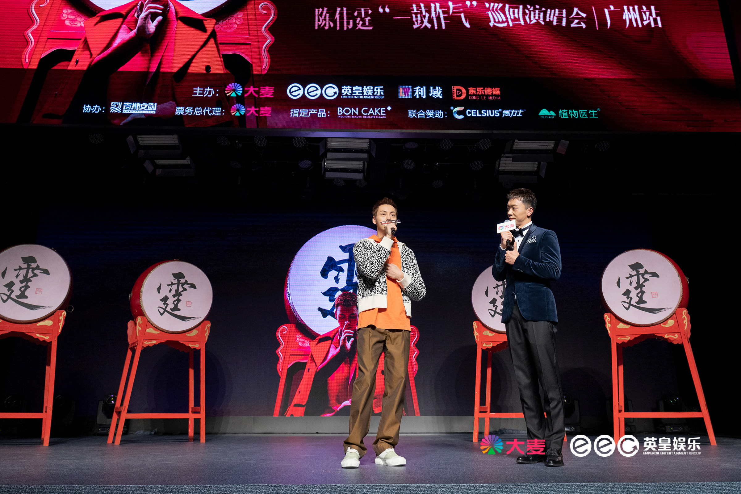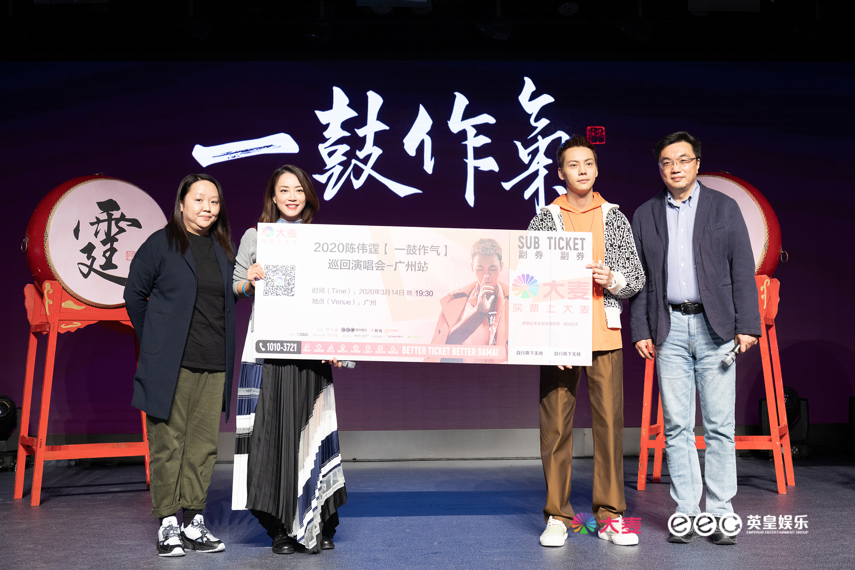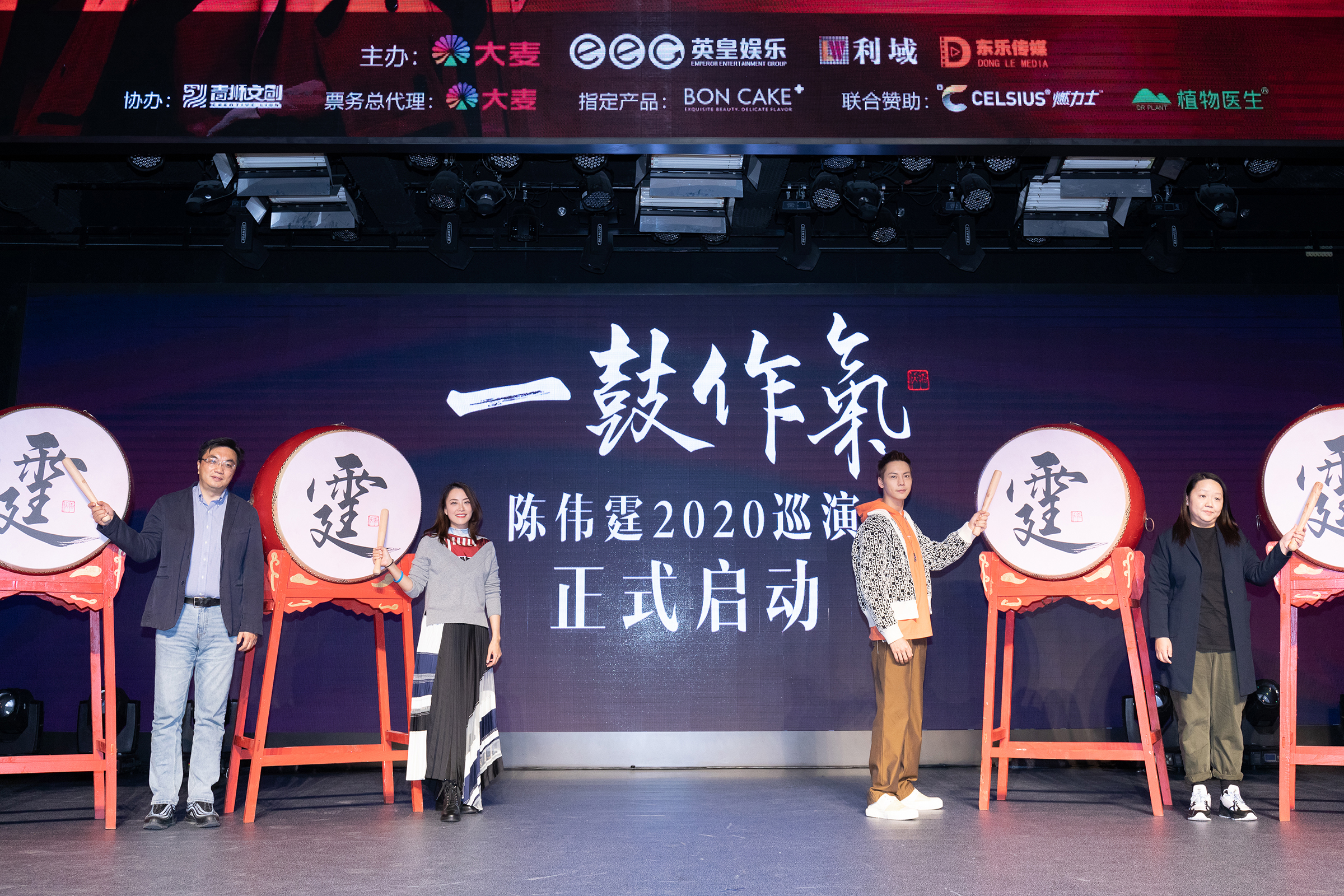 启动仪式上,巡演投资主办方阿里巴巴集团副总裁、大麦网CEO常扬先生,香港英皇娱乐集团COO、英皇(北京)文化发展有限公司CEO霍汶希女士,广州市利域总经理和陈伟霆一同击鼓,磅礴壮阔的鼓声响彻现场,标志着陈伟霆2020“一鼓作气”巡回演唱会正式启动!
