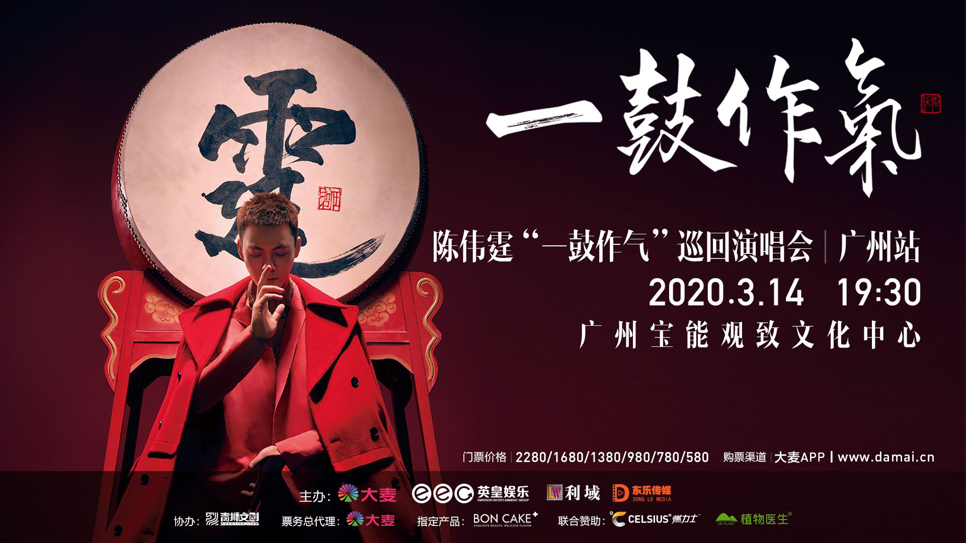 2020年3月14日,广州宝能观致文化中心,陈伟霆2020“一鼓作气”巡回演唱会首场将于1月15日11点21分,在大麦网独家预售,一鼓作气,巡演必大卖!